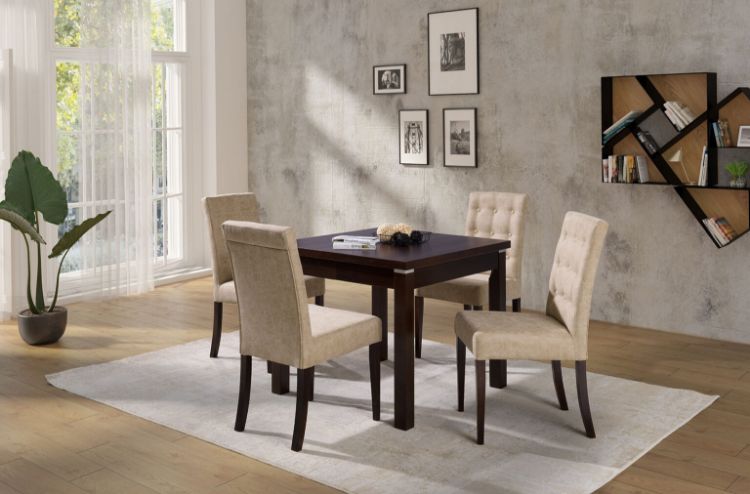 Jedálenský set Lotos 140 + John 1+4. Jedálenský set v modernom prevedení, ktorý obsahuje 1 kvalitný rozkladací stôl a 4 mohutné stoličky, ktoré si viete dať očalúniť podľa výberu zo vzorkovníka.