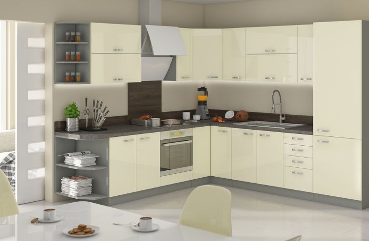 Moderná rohová kuchynská zostava v krémovom lesku.